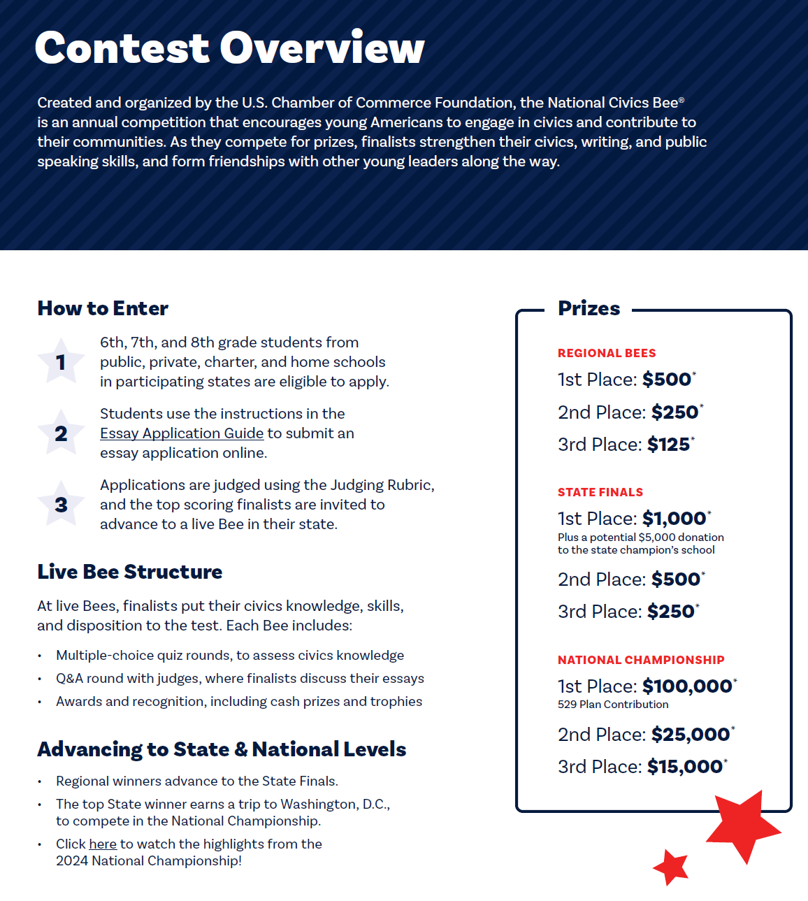 Students should review the Contest Rules and then apply using the following link: 2026 National Civics Bee Application Link